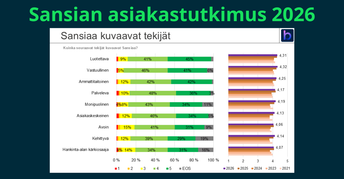 Kyselyyn vastasivat omistaja-asiakkaiden henkilöstön edustajat, jotka olivat eri rooleissa tehneet yhteistyötä Sansian kanssa vuoden 2025 aikana. Tulokset olivat jälleen erittäin myönteisiä: niin Sansian yritysmielikuva kuin henkilöstön toiminta ja asiantuntemus saivat ennätyksellisen hyvät arvosanat.